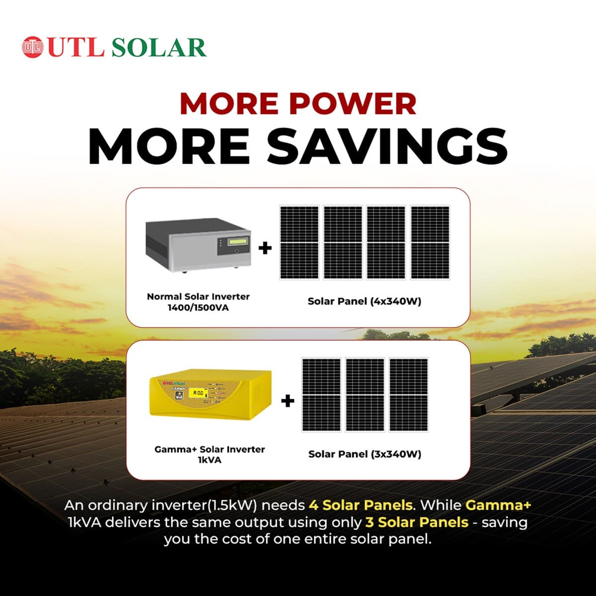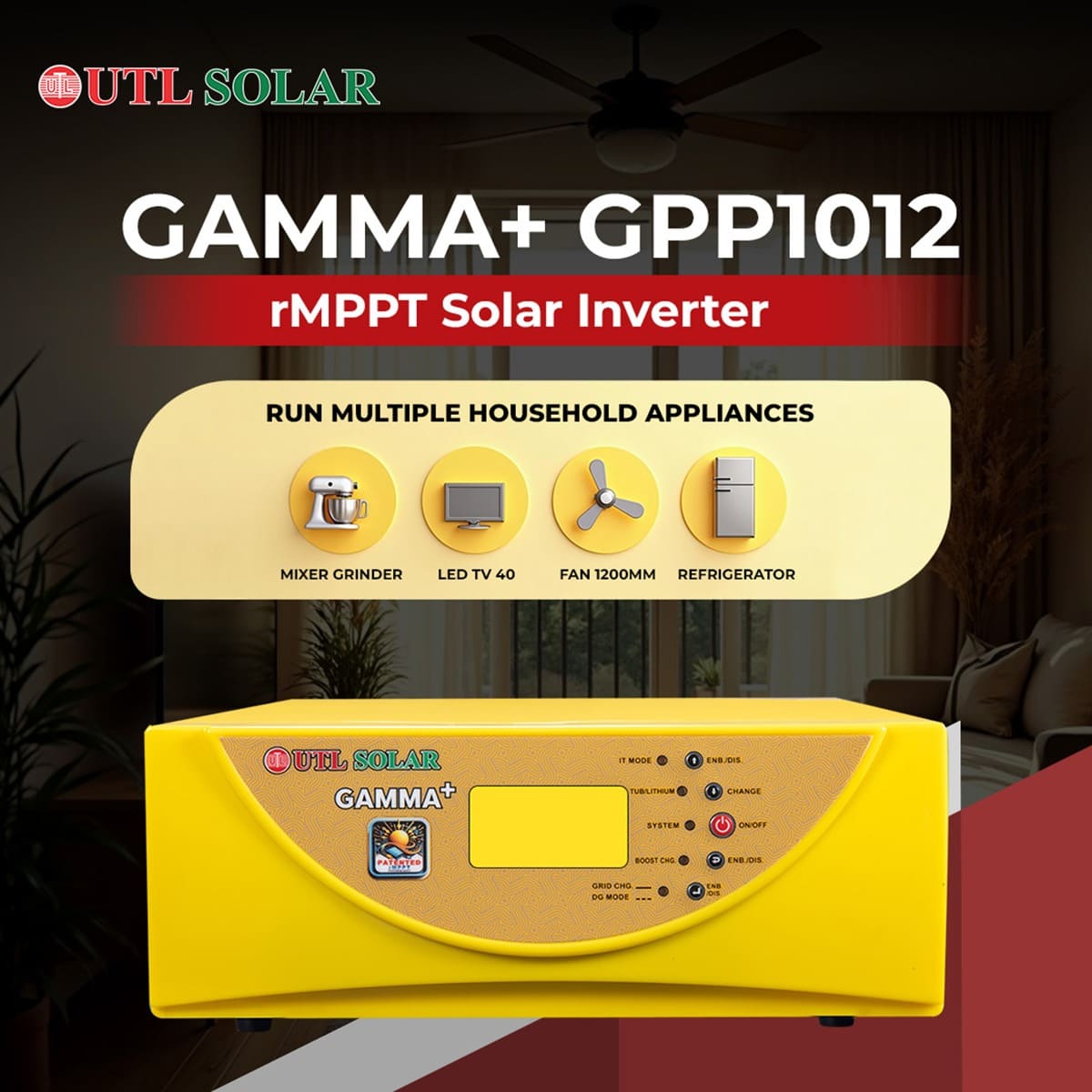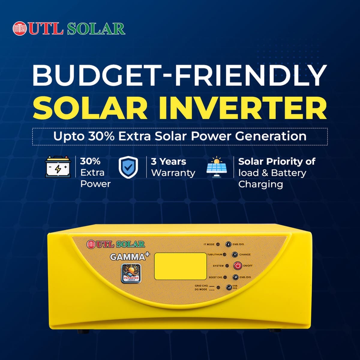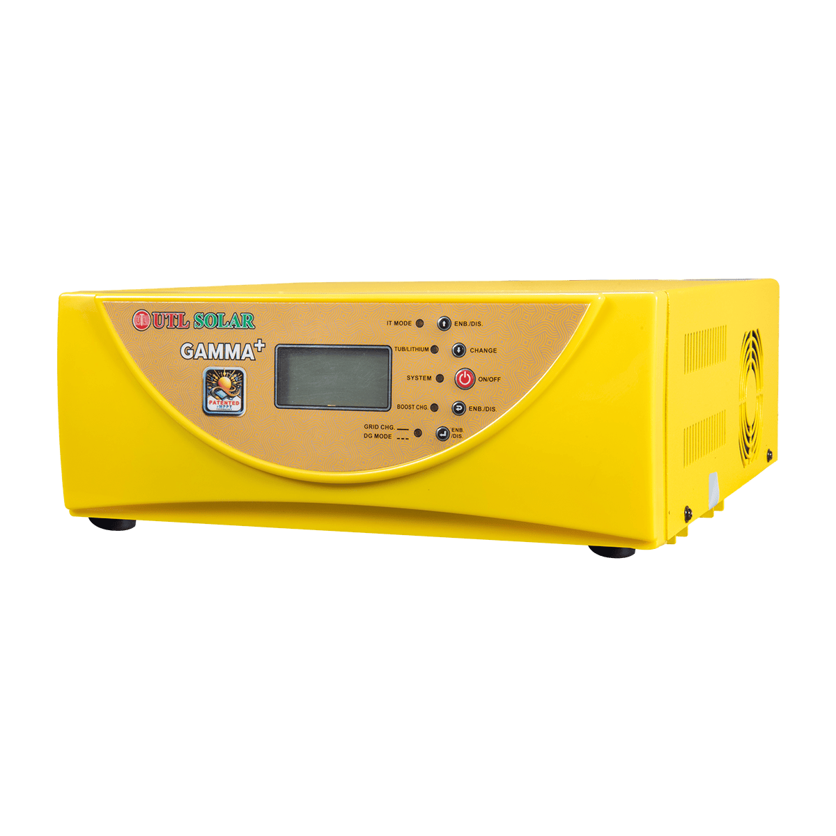 UTL Gamma+ is perfect Solar Inverter for home with Inbuilt MPPT solar charge controller. It continuously monitors Battery and Solar voltage as well as Grid and Output voltage with their currents. MPPT based solar charger extracts the maximum power from the solar panels whereby it increases the efficiency of the system. MPPT technology produces up to 30% more electricity as compared to PWM technology. MPPT charger has multistage charging which maintains the battery charging voltage such that it increases the lifespan of battery. MODES:- * Smart Mode (Default) – Priority Solar → Grid → Battery * PCU Mode – Priority Solar → 50% Battery → Grid * Hybrid Mode – Priority for load Grid →Solar →Battery Usable Watts -Up to 800W Rating Available: 1kVA/12V Warranty: 3 Years For more information please call or whatts app to our customer care number +91 8525095422