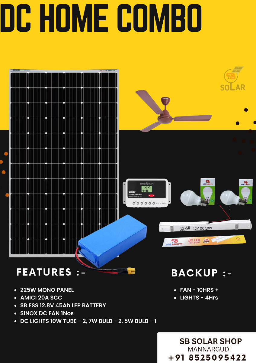This solar dc combo designed for small house or shops who need small table fan with few led lights for 10-12hrs backup. Its is combo with utl 225w mono panel with 45ah LFP battery 3 years warranty and amici smart 20a solar charge controller. Warranty Details:- Solar panel -10 years manufacturing warranty,25 years performance warranty. Battery - 3 years warranty Ceiling fan - 2 Years Dc lights & Controller - 1 year warranty Fot more information please call or whatts app to our customer care number +91 8525095422