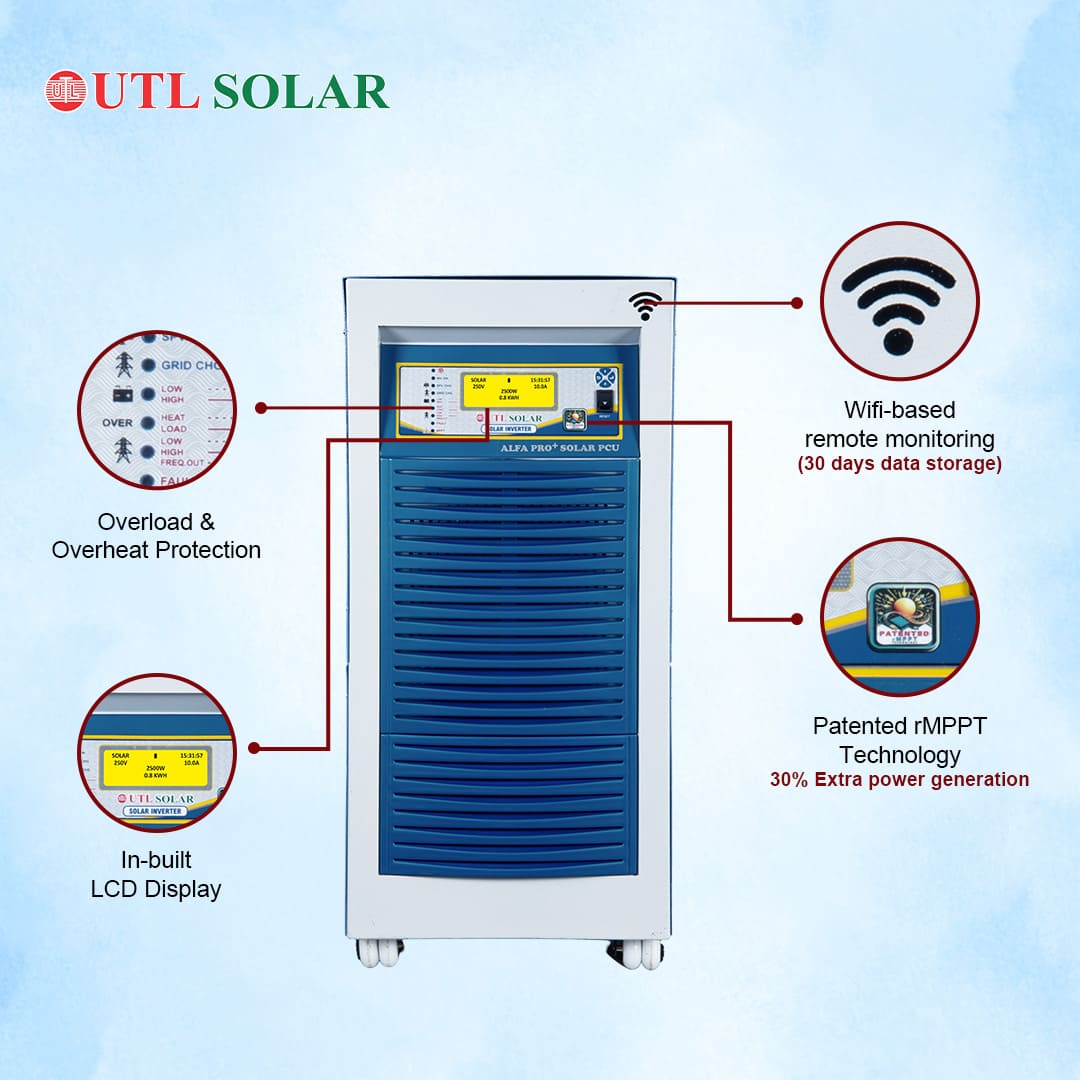 About this Item:- Alfa+ Solar PCU 3kVA/48V that is mainly used in Hospitals, schools, industries petrol pumps, banks and also in home. It continuously monitor battery and solar voltage as well as grid and output voltage with their current. PCU (Power Conditioning Unit) is an integrated unit consists of grid charger, inverter, MPPT Solar Charger. It continuously monitors Battery and Solar voltage as well as Grid and Output voltage with their currents. MPPT based solar charger extracts the maximum power from the solar panels whereby it increases the efficiency of the system. MPPT charger has multistage charging which maintains the battery charging voltage such that it increases the lifespan of battery.