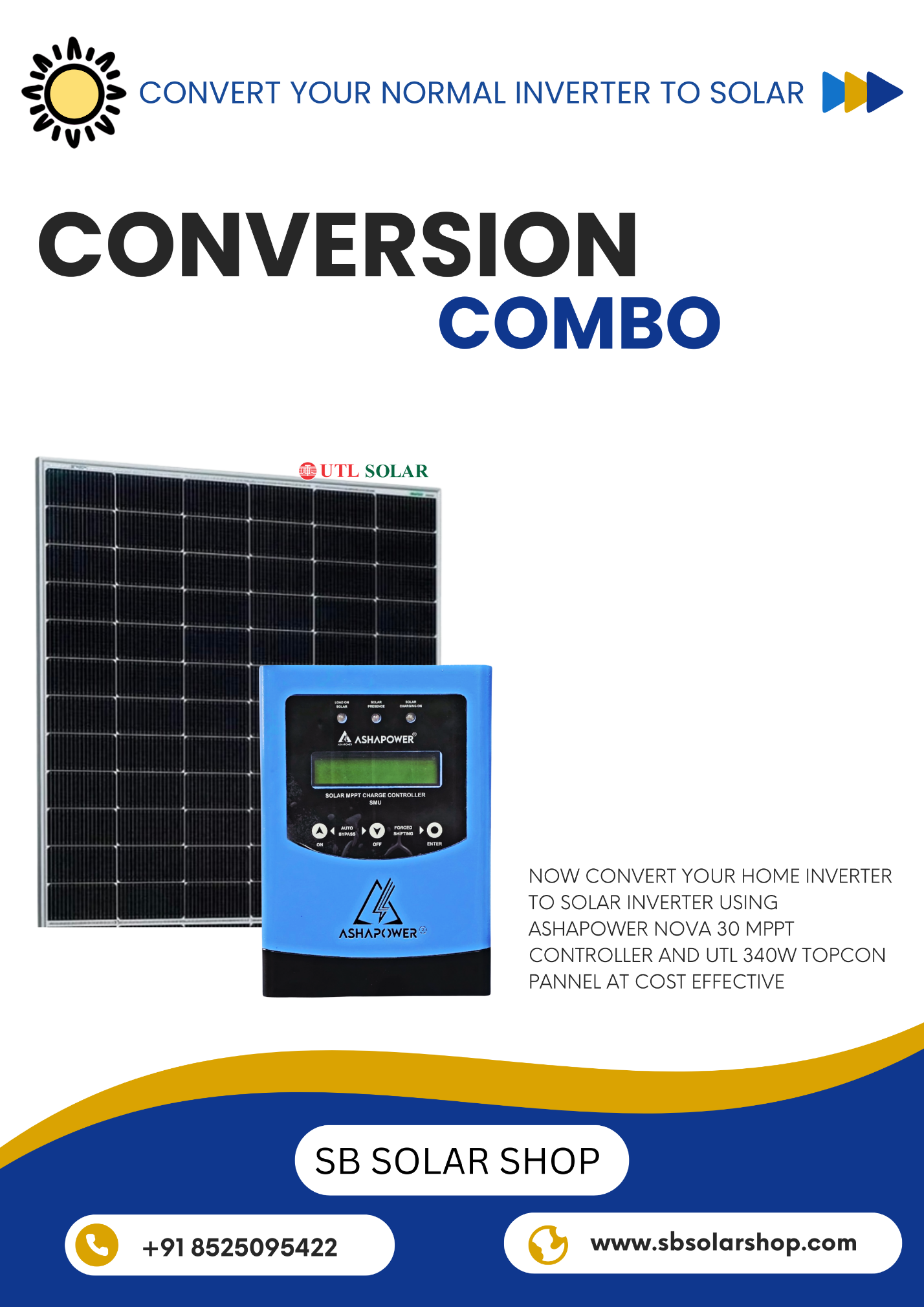 Most of the home and offices installed normal inverter so if want to convert it into solar is now easy by this combo pack. Mainly normal inverter are every home which took power from grid it may increase your electricity bill now choices are here to convert it into solar inverter by using retrofit yeah Ashapower mppt solar charge controller is here. Ashapower MPPT solar charge controller is top retrofit and cost effective through this your normal inverter will become solar. SB shopping makes user to choose pack easy because we choose for you we selected this combo with utl solar 340w topcon . In this combo ashapower mppt 1nos and utl 340w topcon solar panel 1nos accessories are extra based on customer requirments. This combo suitable for who having power consumption of 1 - 1.5 unit for day time usage in 12v system. Pack Details:- Ashapower MPPT -1 nos UTL 340W topcon -1 nos Warranty Details:- Controller - 2 years Panel- 10years manufacturing 25years performance For more information please call or whatts app to our customer care number +91 8525095422