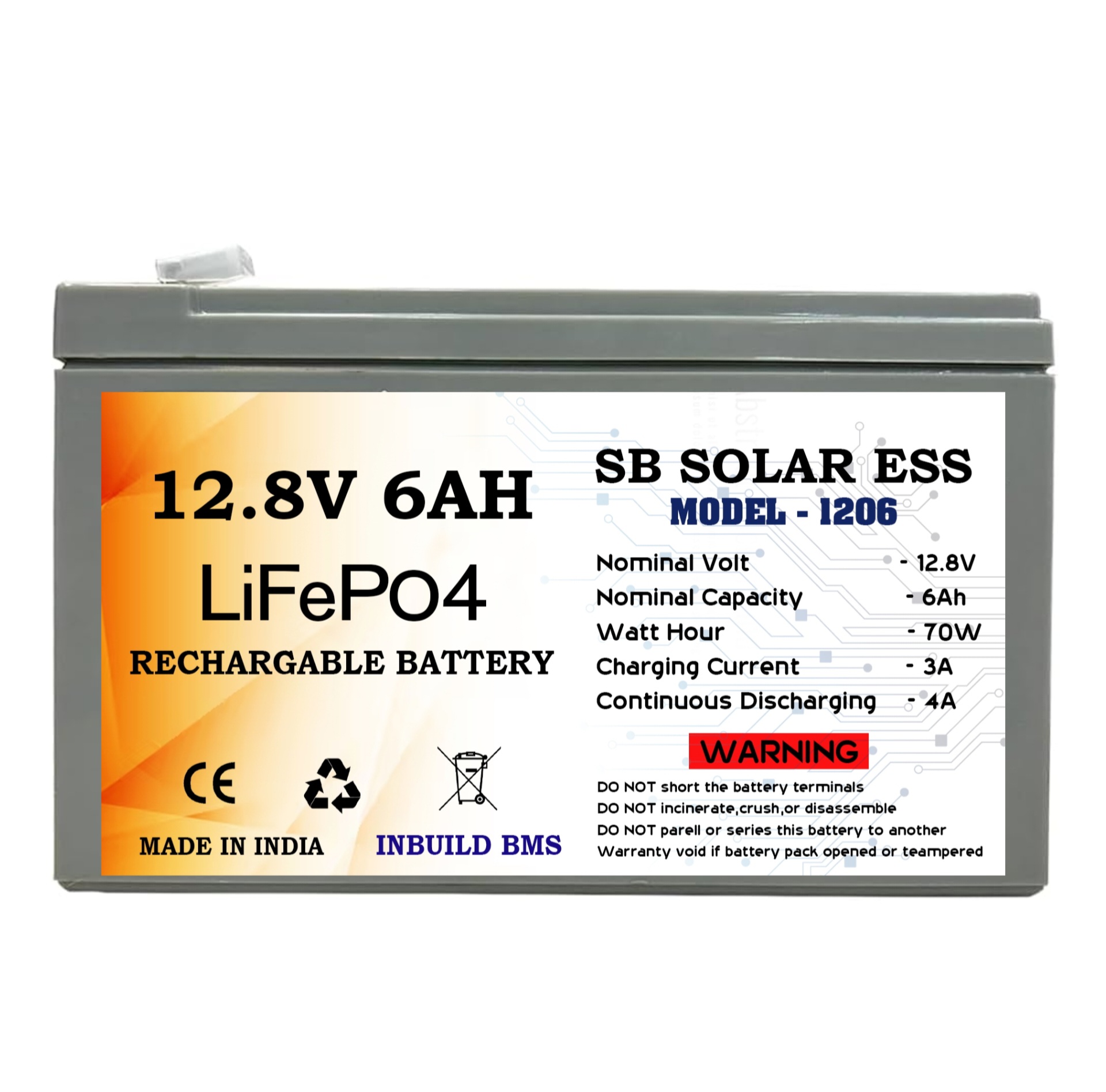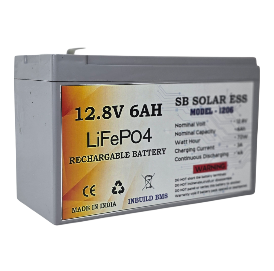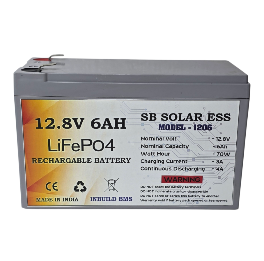 SB solar ESS lithium battery pack made by high quality A grade 3c cells of lipo4 we assembled and supplying for solar dc home projects,street lights, toys and many more... This battery pack mainly recommended for solar dc home projects only (Avoid use in AC inverter)because of avoiding battery damage while using with AC. Our battery pack has inbuilt BMS 10A to protect battery from over charging and discharging. Battery has 3years warranty which is serviced by us and again delivered to respective customers.Warranty will not cover which means physical damage or water damage. Use specified solar charge controller or adopter to charge the battery. Battery Recommended charging current - 2AMP Battery discharge current MAX - 6AMP *** DONOT PARALLEL OR SERIES BATTERY *** For more information please call or whats app our customer helpline number +91 8525095422