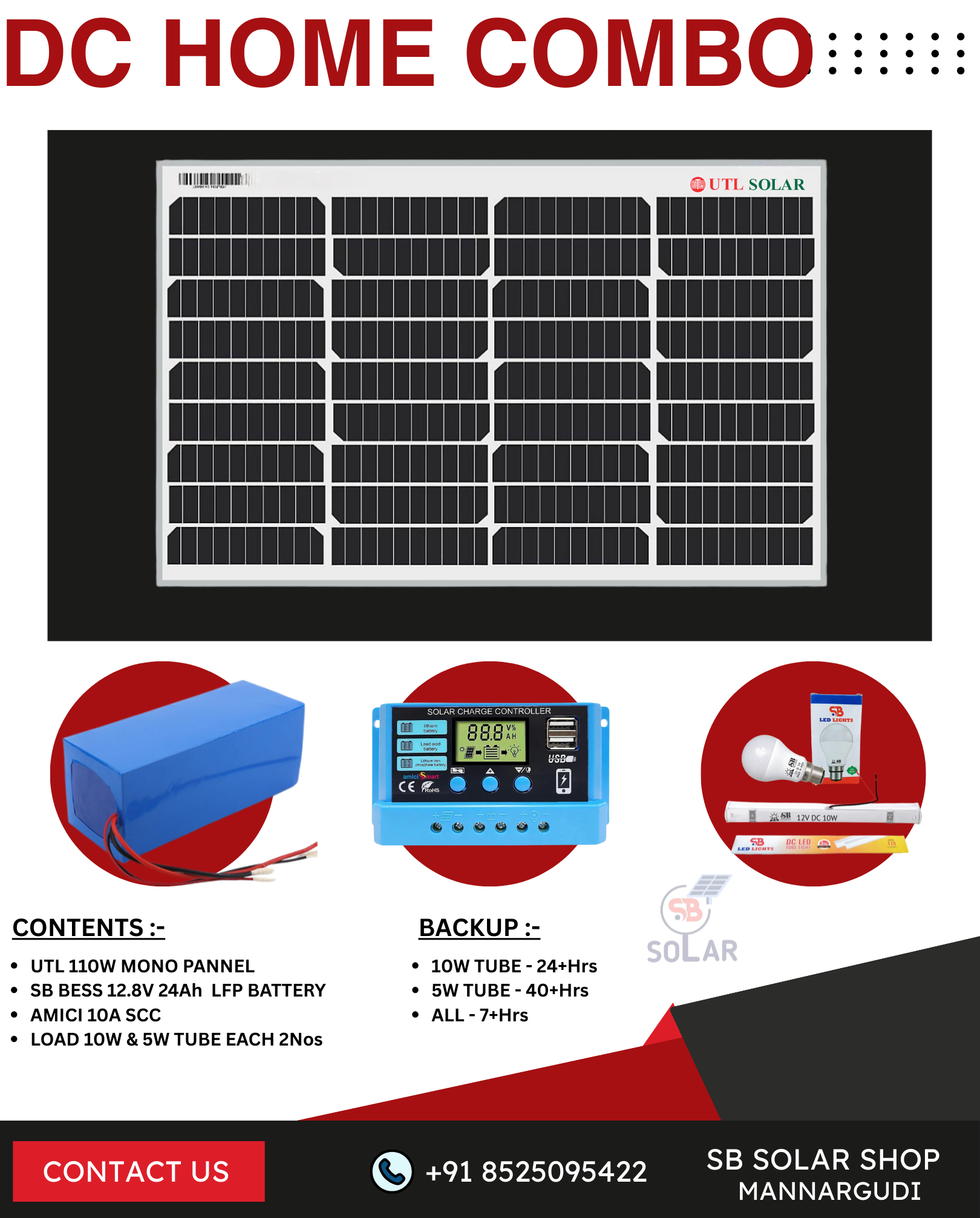 This Dc home combo designed by sb solar group is developed to lighting the house which does not having power supply and rural areas.Pack will gives a brightness and hope from the sun light yes this pack does not need power from grid it will charge the battery directly from sun light through solar panel. This mini pack consist of UTL solar panel 110W(mono perc) 1nos, Sb 24ah lfp battery (3yr warranty) 1nos,10a amici smart solar charge controller 1nos, 10w dc tube light 2feet 2nos,5w dc tube 2nos & mobile charger adoptor. Backup Details :- 10w tube -24+hrs All Lights -6+hrs Warranty Details:- Solar Panel - 10 years manufacturing warranty 25 years performance warranty. Battery - 3 years. Controller - 1 year. DC lights - 1 Year. For more information please call or whatts app to our customer care number +91 8525095422