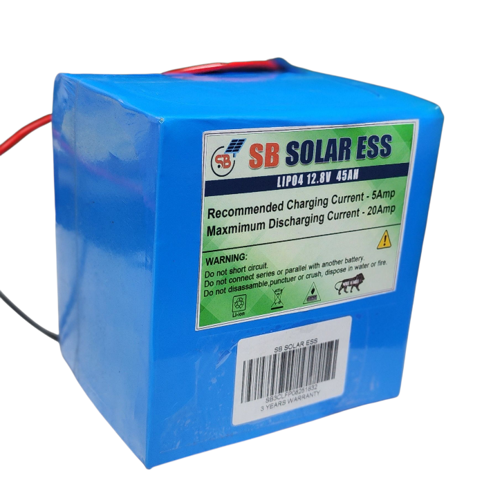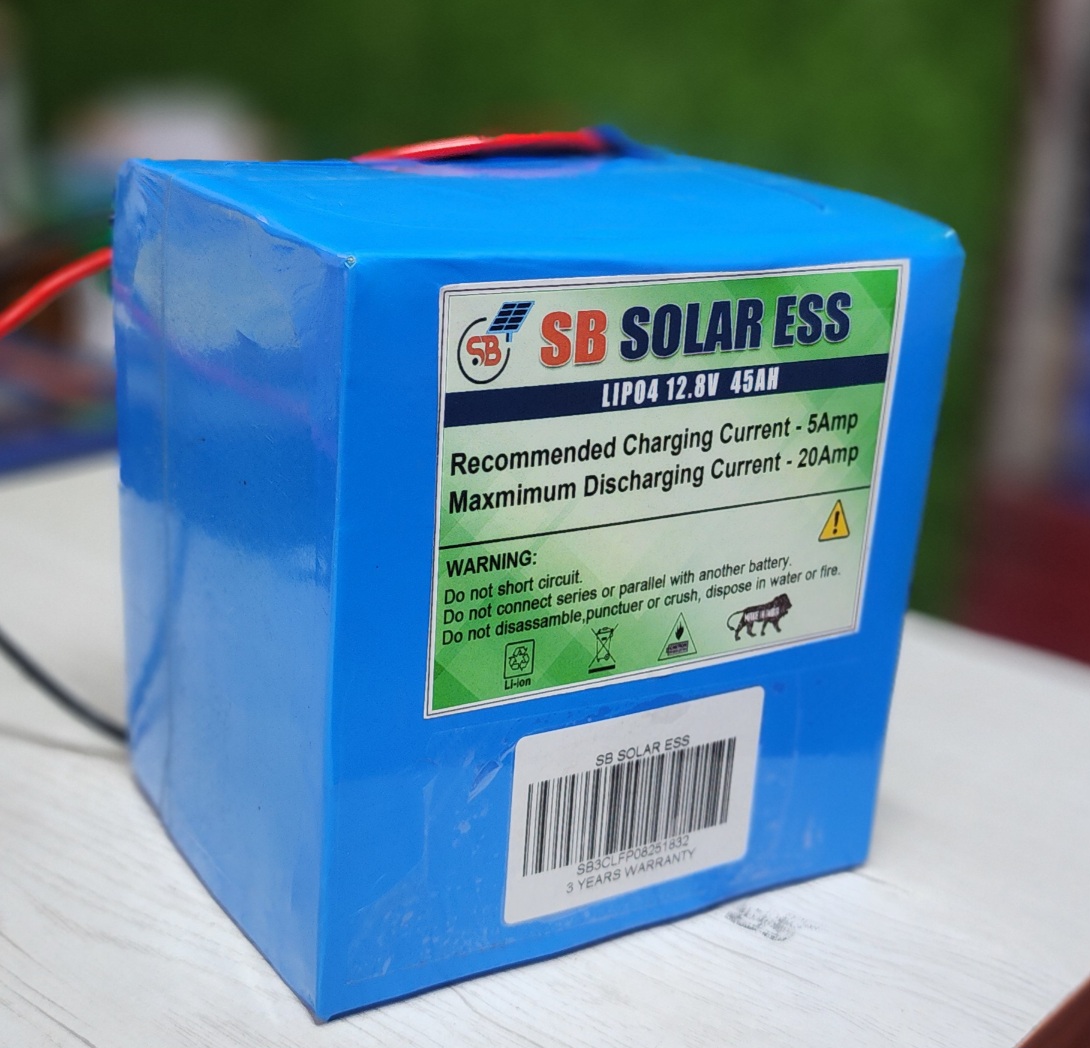 SB solar ESS lithium battery pack made by high quality A grade 3c cells of lipo4 we assembled and supplying for solar dc home projects,street lights, toys and many more... This battery pack mainly recommended for solar dc home projects only (Avoid use in AC inverter)because of avoiding battery damage while using with AC. Our battery pack has inbuilt Daly BMS 30A & 2A active balancer to protect battery from over charging, discharging and ensure long life. Battery has 3year warranty which is serviced by us and again delivered to respective customers.Warranty will not cover which means physical damage or water damage. Use specified solar charge controller or adoptor to charge the battery. Battery maximum charging current - 10AMP Battery discharge current - 30AMP *** DONOT PARALLEL OR SERIES BATTERY *** For Technical Assistance please contact SB SOLAR Helpline +91 8525095422
