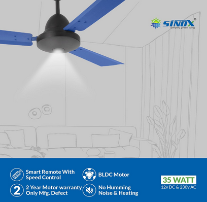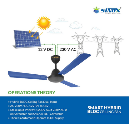 High speed hybrid ceiling fan with remote of speed regulation.it directly run on 12v battery or 60w to 100w solar panel(day only) or 220v ac. This highly strong aluminum wings provide long and high air circulation and it doesnot need any speed regulator for speed control . It having descend remote control to regulate speed control of the fan from speed one to five. NOTES:- Donot use any regulator Have to wiring separately for ac&dc *****2year warranty***** For more details please call or whats app to our customer care number +91 8525095422