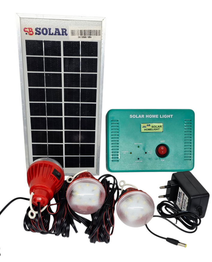 Sb solar Designed and assembled this solar home light system for low budget segments especially for small huts ,small shops like chicken stalls, pani puri stalls,... Pack comes with power box powered by 7.4v 2.5ah lithium ion battery which is high quality 3c cells and its charged by 6v 5w solar panel with 5mtr wire or either ac adopter comes with pack. Pack lighted by 3nos of 6v 3w led bulb with 5mtr wires and mobile charging cable for charging basic mobiles on emergency situations. Package Including:- Kit-1 Solar panel with 5mtr wire- 1 Ac adopter - 1 DC lights -3nos with 5mtr wire Mobile charging small cable - 1 BACKUP DETAILS:- 1bulb -15-17Hrs 2bulb - 7-8Hrs 3bulb - 3 to 4Hrs Warranty Deatails - 1 Year For more information please call or whatts app to our customer care number +91 8525095422